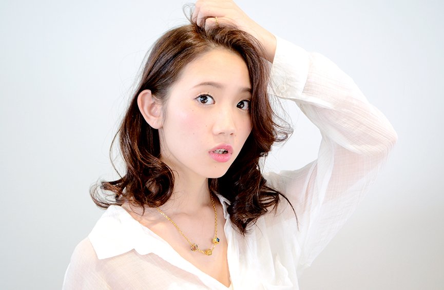 前髪をかき上げたリゾート風ウェーブ。 外国人がバカンスを過ごすようにラフにスタイリングするのがコツ。 強めにカールを出しているので、簡単にお手入れ、スタイリングが キマります。