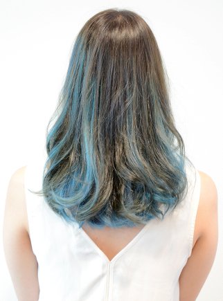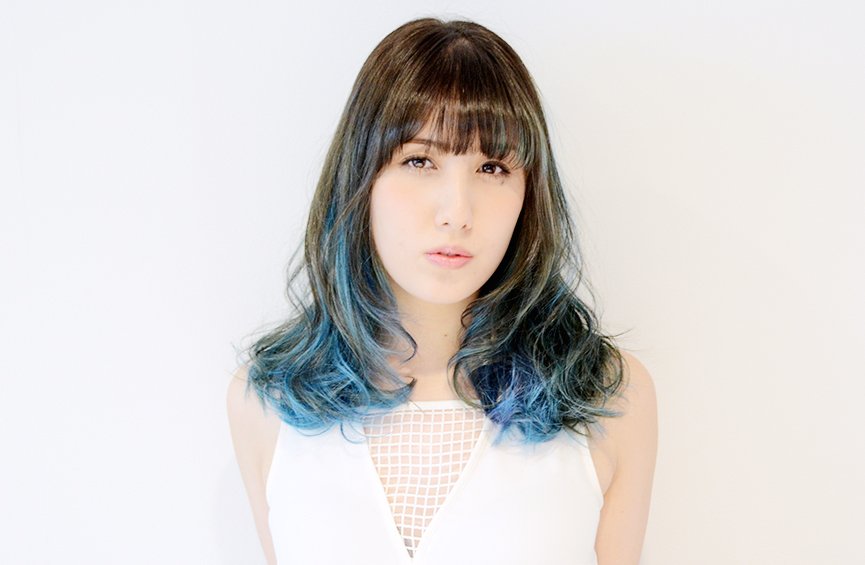 アクアブルー、バイオレット、ラグーンブルーの3色を絶妙なバランスでオン。髪が動くたび違う表情に。